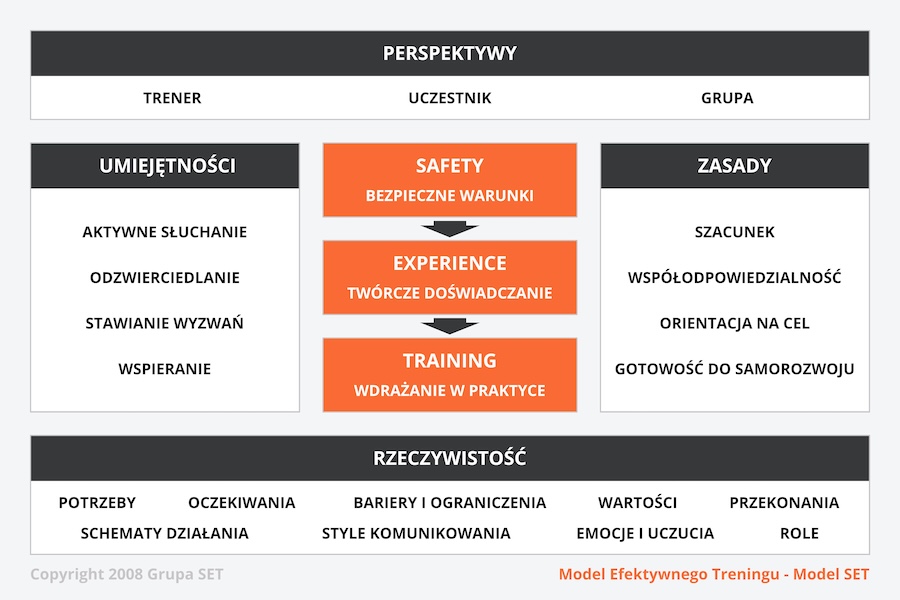 Pierwszy pod kątem zarówno chronologii, jak i ważności element Modelu SET®. Trener po pierwsze koncentruje się na budowaniu bezpiecznej atmosfery już na etapie badania potrzeb szkoleniowych, a potem projektowania programu rozwojowego i konstrukcji modułów szkoleniowych. Niby nic nowego, ale Model SET® wyklucza korzystanie z gotowych modułów, kładąc nacisk na przygotowywanie ćwiczeń i case’ów w oparciu o gruntownie przedyskutowaną z Klientem specyfikę pracy jego firmy czy działu tak, aby uczestnicy szkolenia mieli przekonanie, że trener zna i rozumie ich problemy. Zatem najpierw gruntowna analiza potrzeb zarówno firmy (sponsora), jak i uczestników. Po drugie, już podczas szkolenia, czy warsztatu, najważniejszym krokiem, który musi postawić trener, aby osiągnąć swój cel jest zbudowanie sojuszu z grupą. Model SET® zbudowany jest na doświadczeniu, że zdecydowana większość trudnych sytuacji na sali jest prowokowana przez trenera, dlatego musi on skupić się na tym, aby dać uczestnikom tyle przestrzeni ile będą dla siebie potrzebowali, aby czuć się komfortowo. Ludzie dużo szybciej się uczą, gdy mogą się bawić. Ale, aby mogli się bawić, potrzebują sprzyjającej, bezpiecznej atmosfery. (…)